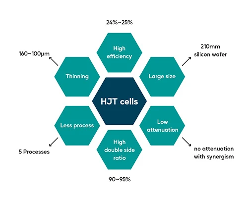- Gain de puissance supplémentaire : Les cellules HJT avec des structures symétriques à l’avant et à l’arrière ainsi qu’une conception de grille atteignent un taux d’utilisation du côté arrière de plus de 95%, offrant plus de 30% de gain de puissance supplémentaire par rapport au PERC et au TOPCON.