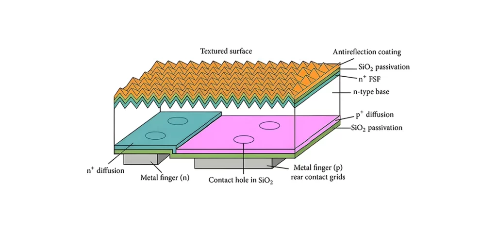 Les principales variations structurelles des cellules solaires IBC comprennent l’introduction d’une couche de diffusion caractérisée par des couches de type n et de type p qui se croisent, permettant l’installation de contacts métalliques à l’arrière.