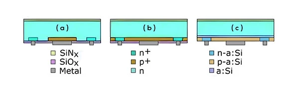 La couche principale des cellules solaires IBC est constituée d’une plaquette de silicium cristallin (c-Si) de type n ou de type p, servant de couche d’absorption. Cette couche est créée en dopant la couche de silicium cristallin avec du bore ou du phosphore pour produire des plaquettes dopées de type p ou de type n. Par la suite, un revêtement antireflet et de passivation en SiO est généralement appliqué sur une ou les deux faces de la cellule solaire.